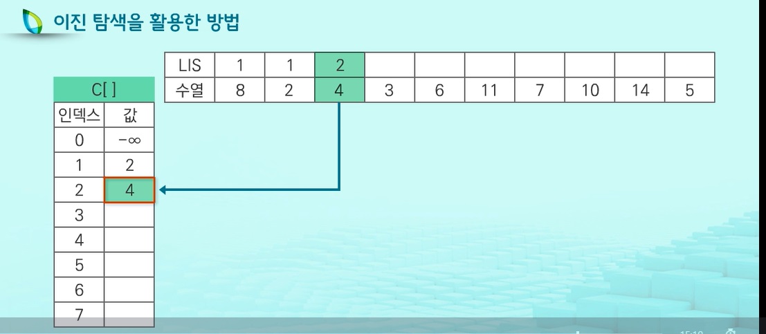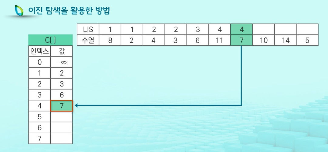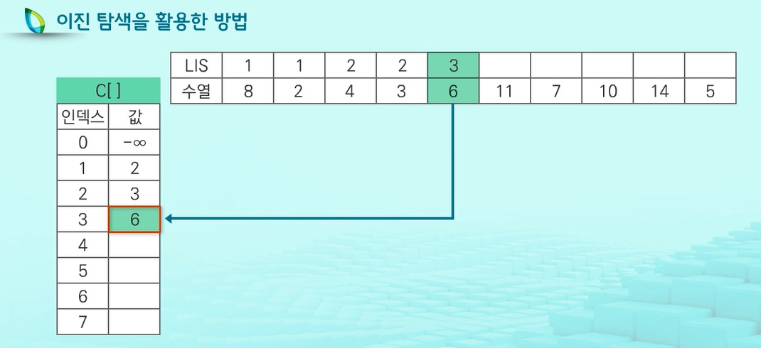 마찬가지로 11을 읽고 C배열에서 11보다 작은 값 중에서 가장 큰 값인 6 뒤에 붙여주면.. 길이가 4인 증가하는 부분수열이 된다.