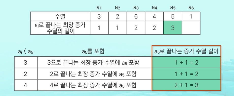 $a_{4}$로 끝나는 최장 증가 수열(길이 2)에 $a_{5}$를 포함시키면, 그 수열의 길이는 3이다