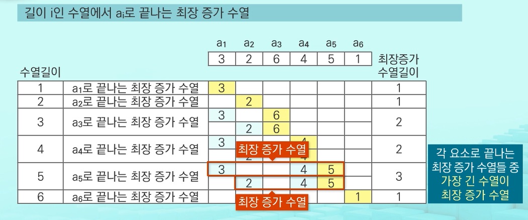 그래서 $a_{i}$로 끝나는 최장 증가 수열들 중에서도 가장 긴 수열이 전체 수열에서 최장 증가 수열이 된다