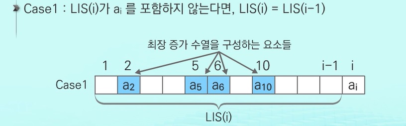 i개의 부분수열 $a_{1}, a_{2}, ..., a_{i}$에서 마지막 원소 $a_{i}$를 포함하는 최장 증가 부분수열의 길이 DP[i]는...