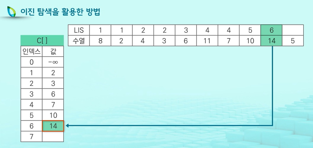 C배열의 길이 6이 전체 수열에 존재하는 가장 긴 증가하는 부분수열의 길이이다.