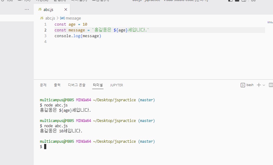 키보드 숫자 1 왼쪽에 ` `(backtick)으로 문자열을 나타내면 여러 기능을 사용할 수 있음