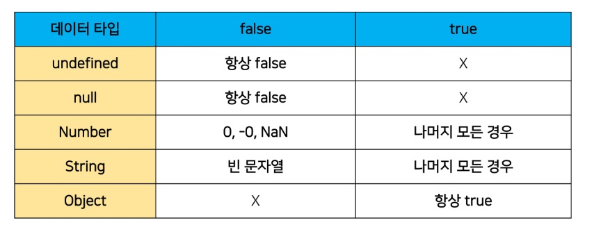 파이썬이랑 대충 비슷하네... 빈 값이나 null, undefined는 false이고 다른건 true