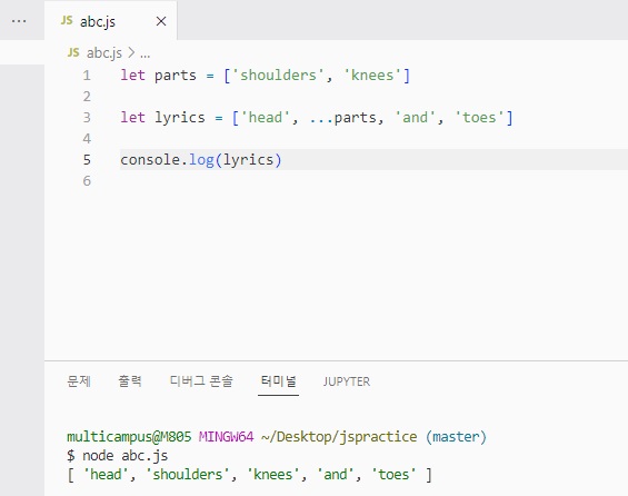 전개 구문을 사용하면 배열이나 문자열과 같이 반복 가능한 객체를 배열의 경우는 요소,