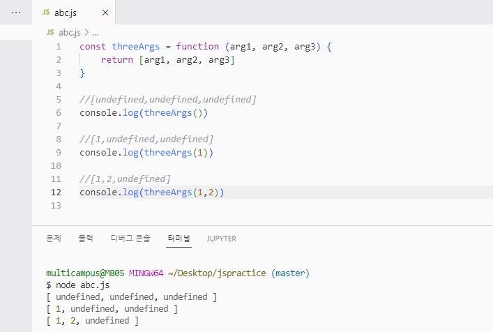 자바스크립트에서는 매개변수의 개수와 인자의 개수가 안맞아도 에러가 나지 않는다