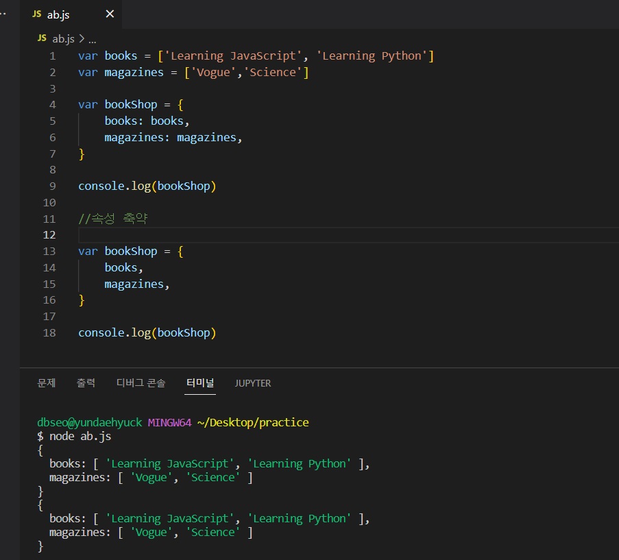 객체 정의할때, key와 할당하고자 하는 변수의 이름 value가 서로 같으면 key:value로 쓰던걸 key,로 축약 가능