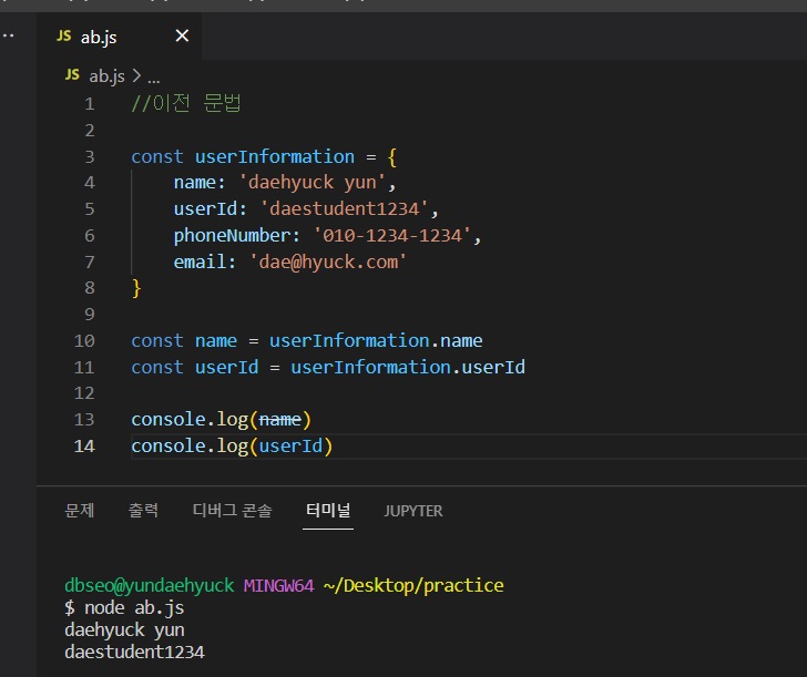 변수선언키워드 {변수명1,변수명2,...} = 객체명