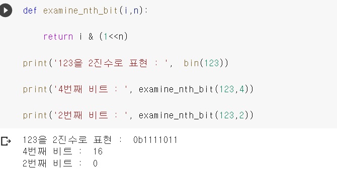 그래서 i & (1<<n)은 정수 i의 n번째 비트가 꺼져있다면 0을 반환하지만, 켜져있다면 n번째 비트만 켜진 정수를 반환한다