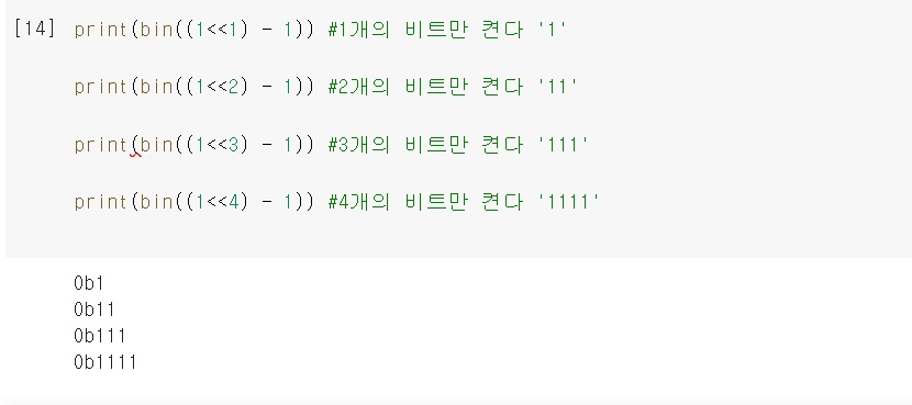 위에서 n개의 비트를 모두 켤려면 (1<<n)-1이면 된다는 것을 보였다