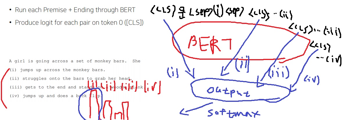 각각을 scalar로 만들어주는 동일한 output layer에 넣고 softmax를 넣으면 4개의 문장에 대한 확률분포가 나온다.