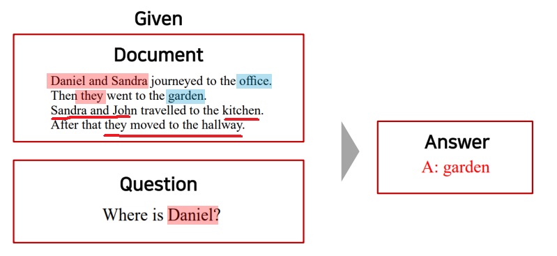 4명의 등장인물과 4곳의 장소간의 관계를 잘 이해하고 그 중 daniel이 어디에 있냐는 질문에 garden에 갔다는 것을 답으로 제시함.