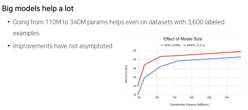 parameter가 더 큰 BERT large모형이 BERT base모형보다 성능이 좋았다는 점도 눈에 띈다.