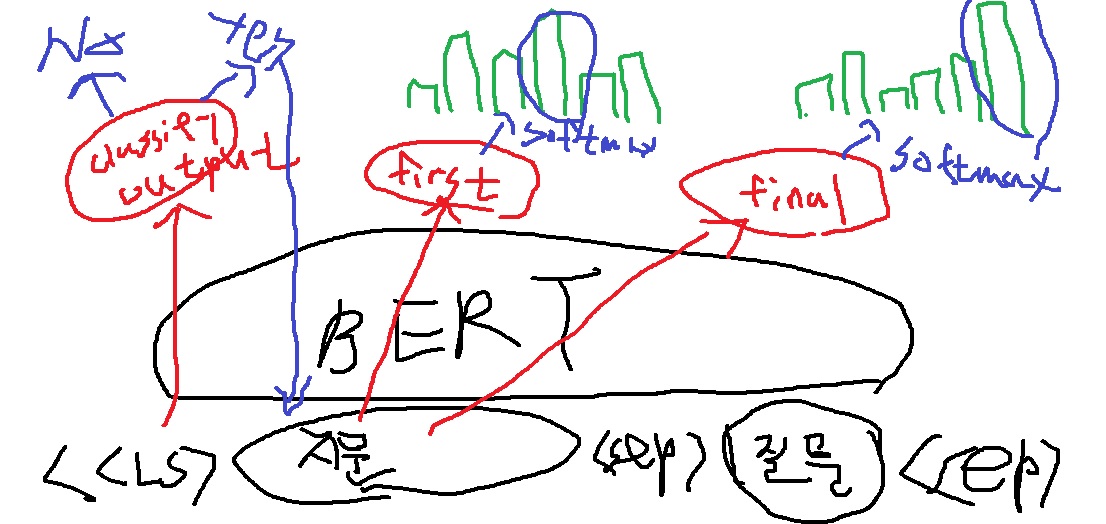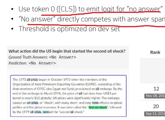 답이 없으면 no answer로 내면 끝이지만 답이 있으면 지문의 단어 벡터를 이용하여 위에서 수행한 SQuAD 1.1의 start index, final index를 예측하는 model을 수행한다.