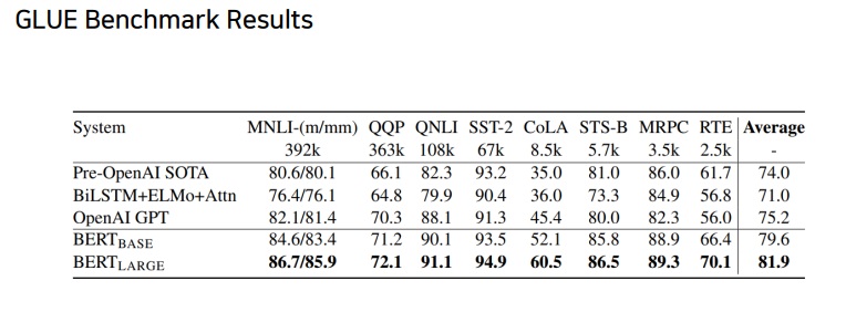 GLUE는 각종 task에 대한 data를 한 곳에 모아놓은 사이트? data set? 정도로 보면 되는데 각 task별 fine-tuning 성능을 보니 BERT가 대부분 성능이 좋았다.