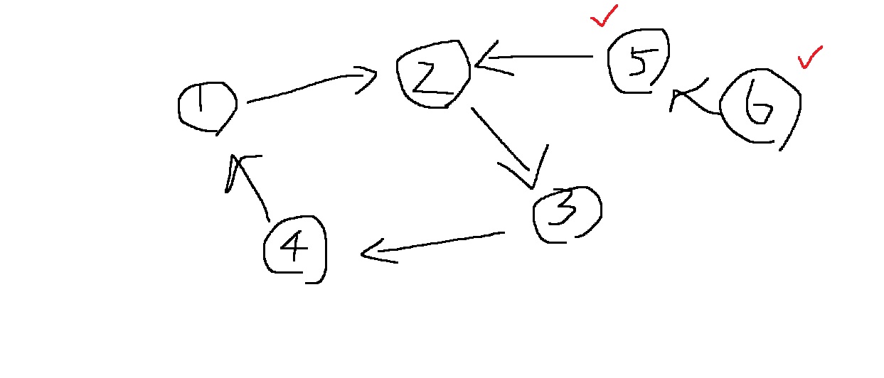 1,2,3,4가 사이클인데, 진입차수가 0인 6번을 넣고, 다음에 5번을 넣고, 처리하더라도 1,2,3,4는 진입차수가 0이 아니니까