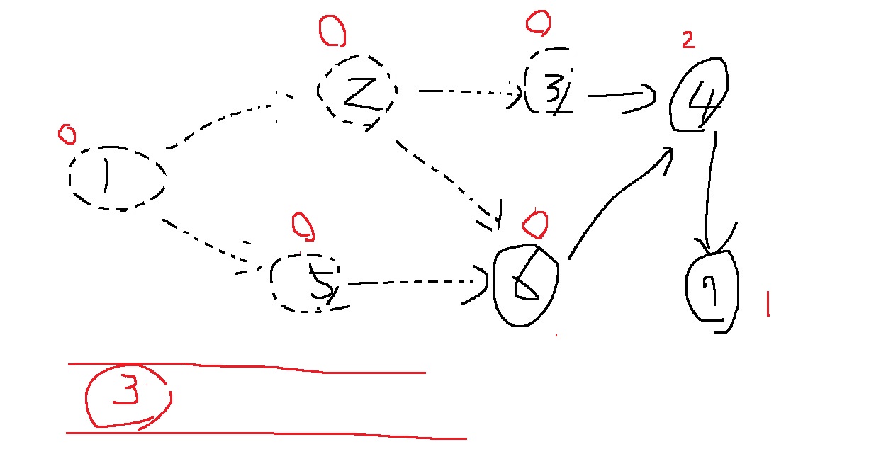 그러면, 3번이 새롭게 진입차수가 0이 되고 이것을 큐에 넣는다.