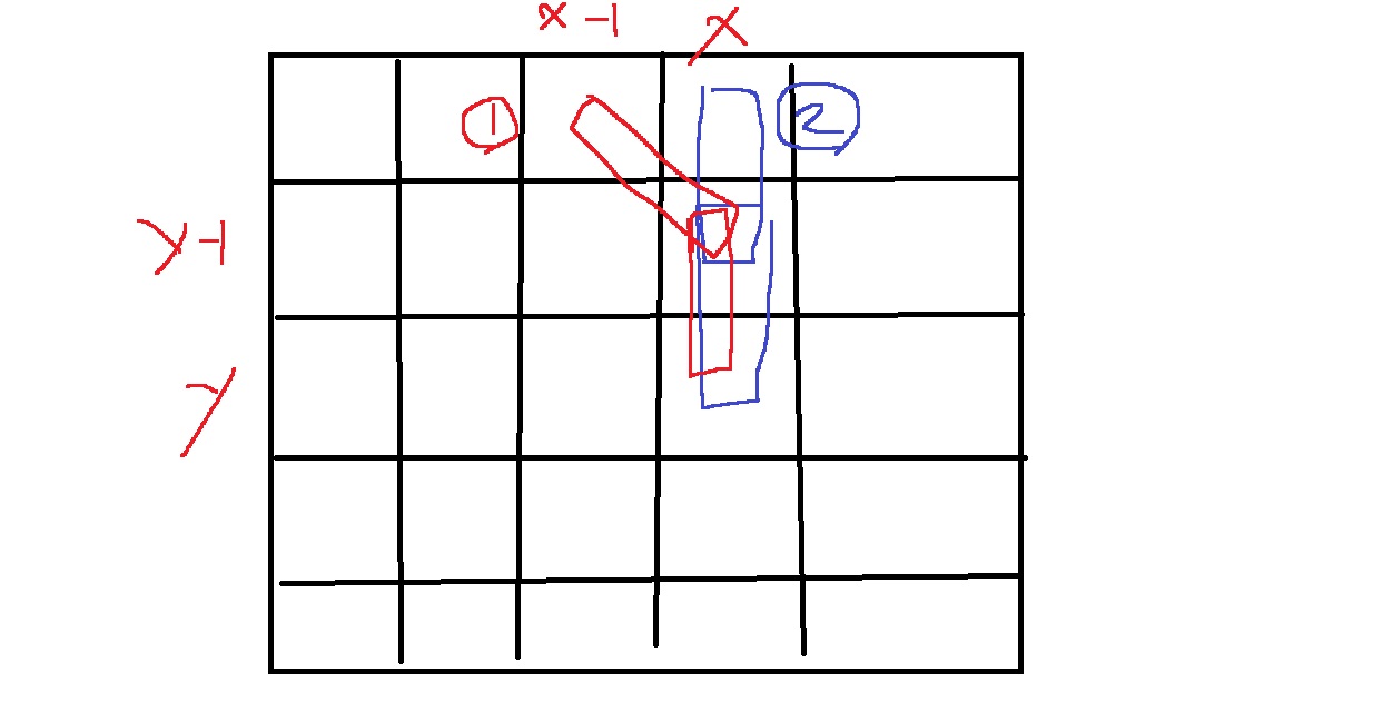 위와 같이 (x,y-1)에 대각선으로 들어오는 경우(1)와 위에서 아래로 들어오는 경우(2)를 합하면 된다