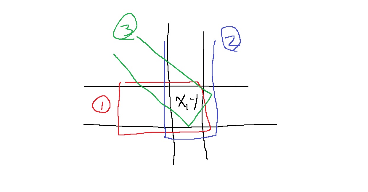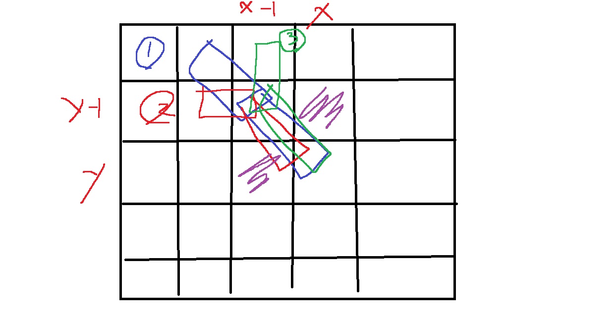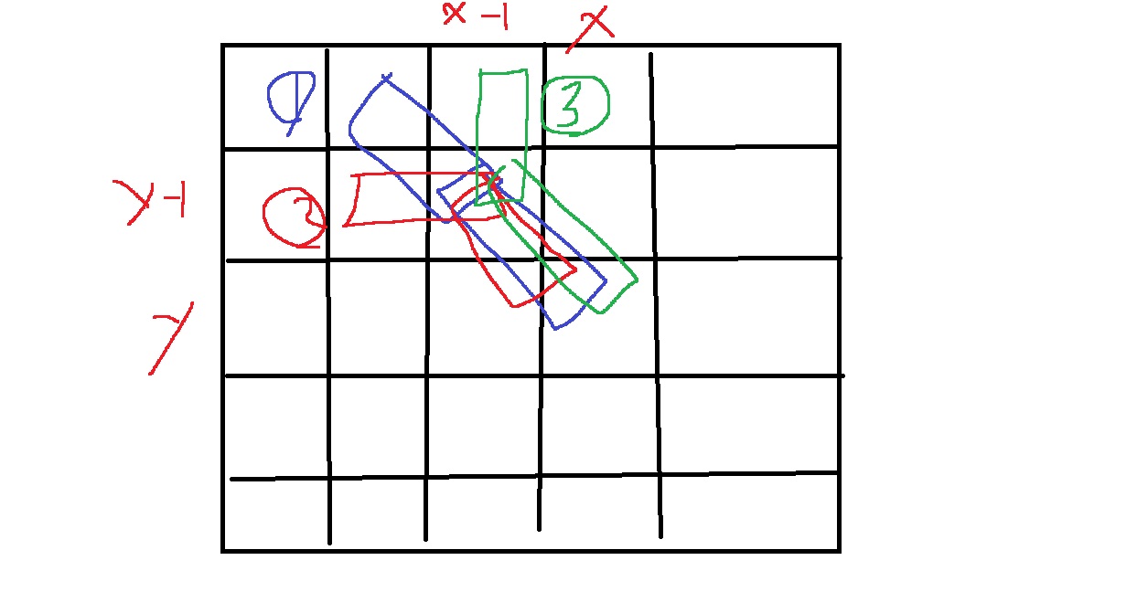 먼저 위와 같이 (x-1,y)지점에 대각선으로 들어오는 경우, 다음 (x,y)에 가로로 붙이면 된다