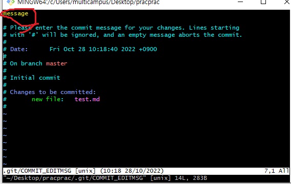 위에 message가 직전 commit 메시지이고, 이걸 수정하기 위해 i 버튼 누르고