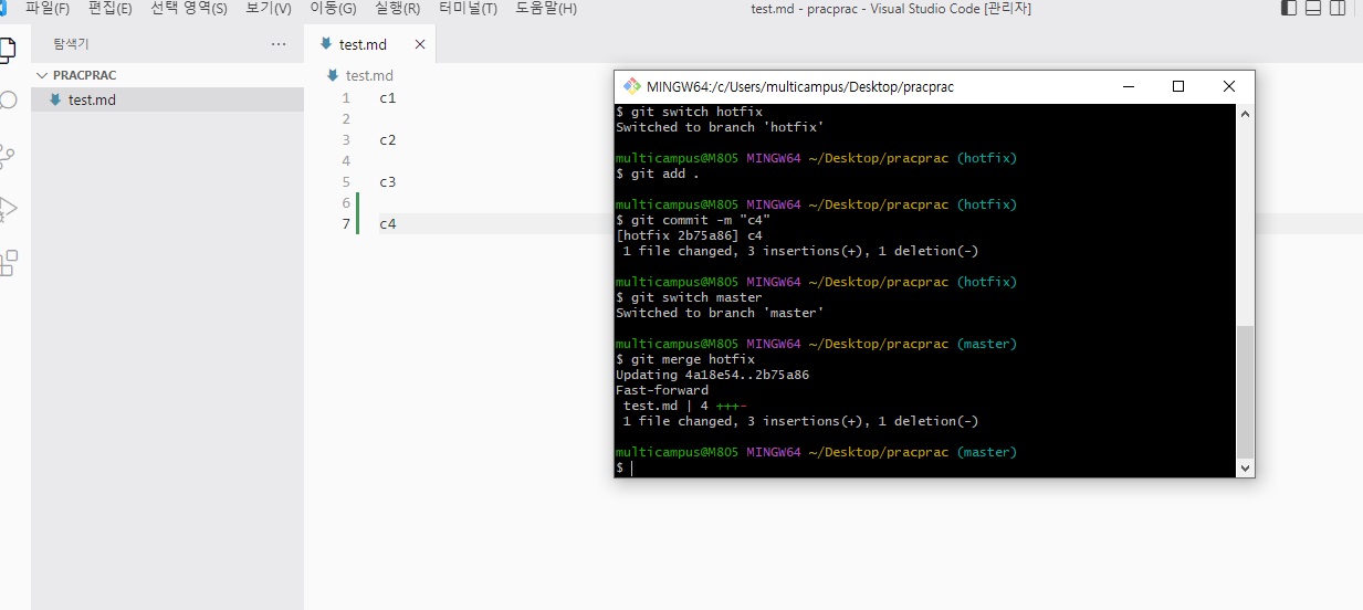 명령어는 모두 (master에서..) $git merge hotfix로 동일하거든