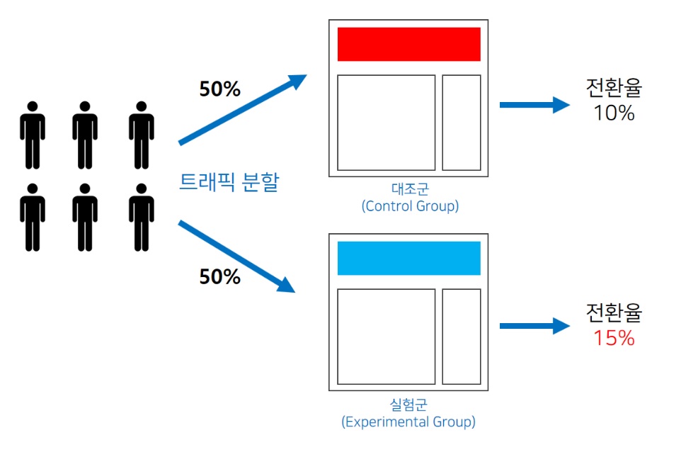 한 그룹(실험 그룹)은 개선된 조건으로 실험을 수행하고, 다른 그룹(대조 그룹)은 기존 조건으로 실험하여 그 결과를 비교하는 방식입니다.