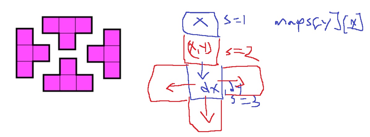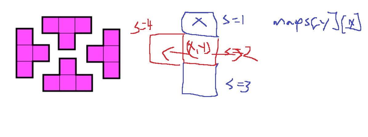 다시 (x,y)에서 dfs 탐색을 하면 s=4일때 양 옆으로만 이동이 가능해서 보라색 블록을 그릴 수 있게 된다.