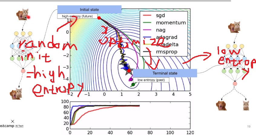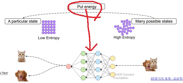 데이터나 정보를 주어 optimization을 하면 low entropy상태가 되어 개+고양이를 개와 고양이로 분류해냄