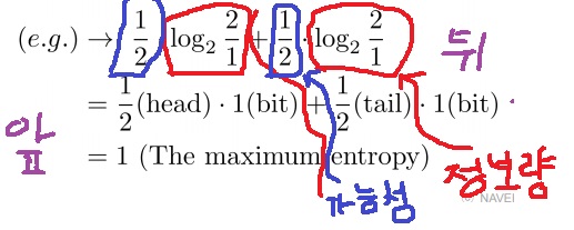 동전을 던져 앞면이 나올 확률은 1/2이고 뒷면이 나올 확률은 1/2이면 entropy는?