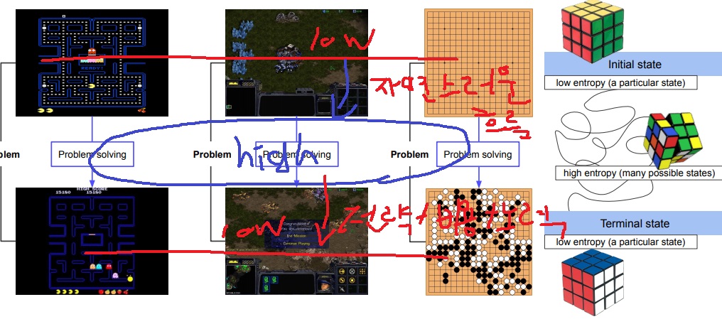 여기에 플레이어의 비용, 노력, 전략들이 들어가면서 게임 1판을 끝내면 terminal state가 되어 entropy가 줄어들어서 low entropy가 된다