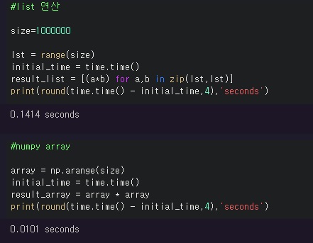 numpy array는 c를 기반으로 만들어져 python list에 비해 가속(속도가 빠름)되었음