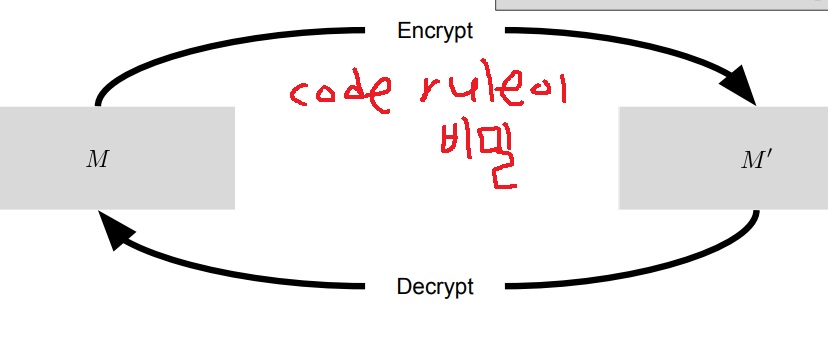 code rule이 외부에 알려지지 않은 encoding을 encrypt라 하고 이 경우 복원 과정을 decrypt라고 부름