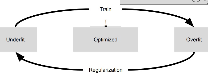 model의 underfit 상태에서 train을 진행하면 overfit 상태로 가고 overfit 상태에서 regularization을 통해 underfit 상태로 변화시킨다.