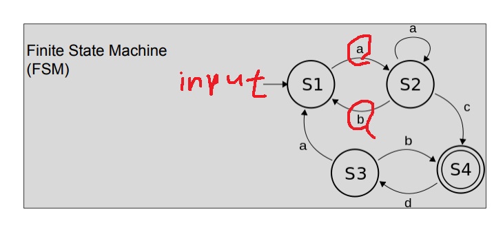input을 받으면 S1에서 시작하고 a를 주면 S2로 간다는 뜻이 아니라 S1에서 a를 받으면 S2로 가는것