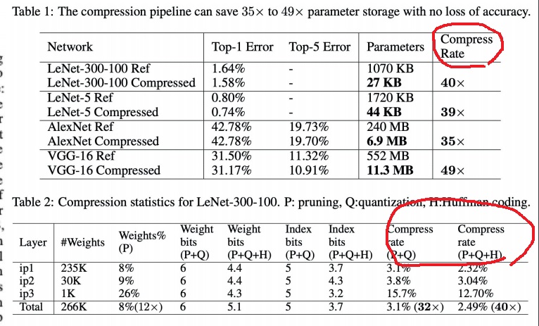 pruning과 quantization을 조합한 기법이 model size 약 98%까지 압축해도 accuracy loss가 0%, 정확도 손해가 거의 없다는 것도 보였음