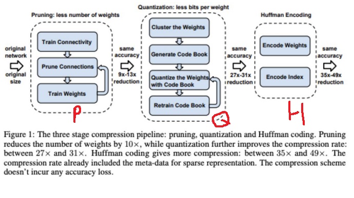 서로 independent한 pruning, quantization, huffman coding의 적절한 조합으로 compression을 하는 방법을 제안한 논문