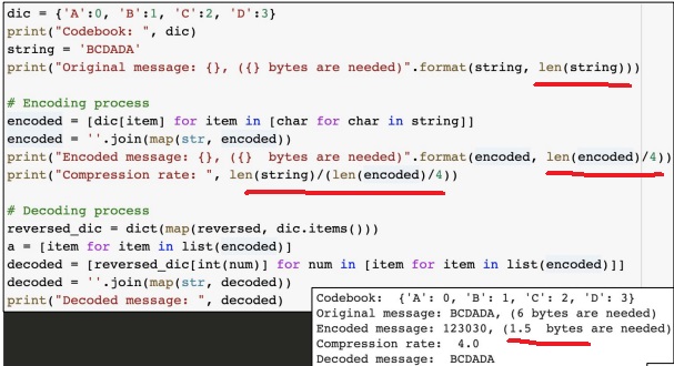 1byte=8bit니까 1bit는 (1/8)byte이므로 8로 나눠서 byte를 구했음(len(encoded)/8)