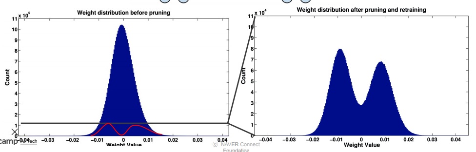 pruning을 하면 오른쪽 weight value 분포로 변하면서 0 주변의 weight들이 상당히 많이 없어짐