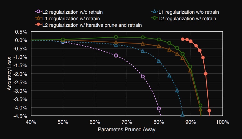 그리고 pruning을 할때 retrain을 할 것이라면 되도록이면 L2 regularization을 하는 것이 더 좋다는 사실