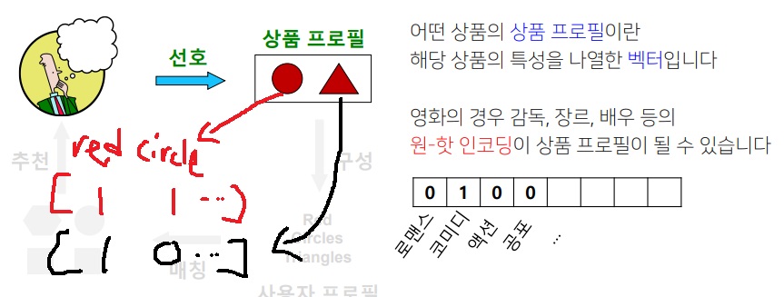 사용자 프로필은 사용자가 선호한 상품들의 정보가 하나의 벡터에 집약되어 있다.