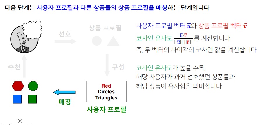 현실적으로는 해당 사용자가 과거에 선호한 상품과(사용자 프로필에 담겨있음) 현재 추천하고자 하는 상품이 유사하다는 뜻이다.
