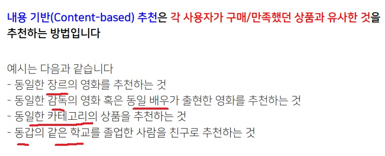 각 사용자가 구매했던, 혹은 만족했던 상품과 유사한 것을 추천하는 방법