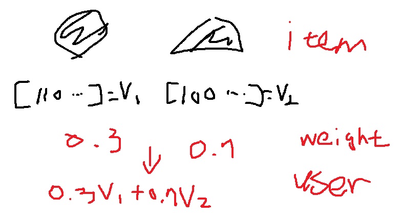 선호 가중치를 이용하여 상품 프로필(item profile)의 가중합벡터를 구한다. 이것이 사용자 프로필(user profile)이다.