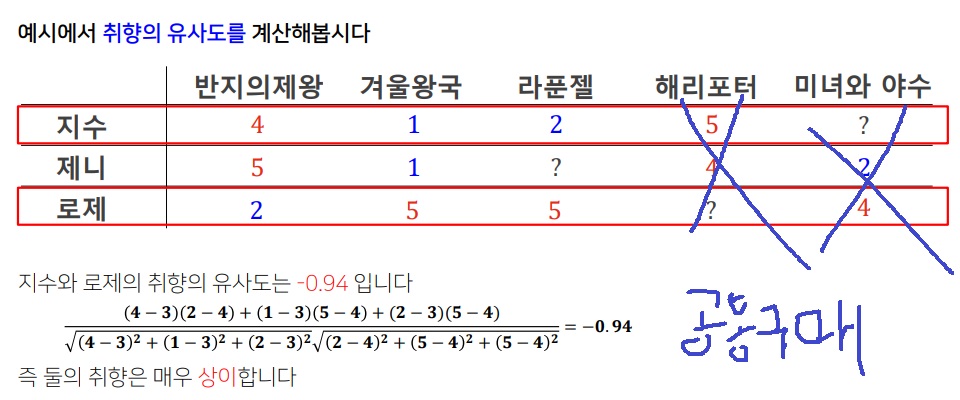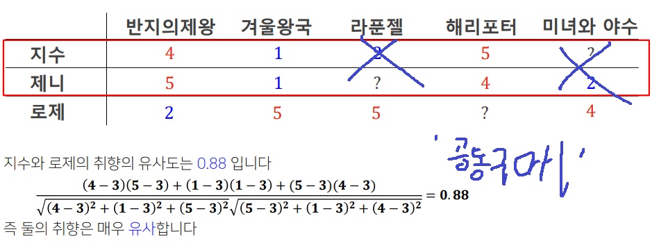 제니가 미녀와 야수를 좋아하지 않았기 때문에 취향이 비슷한 지수도 미녀와 야수를 좋아하지 않을 확률이 높아 지수의 "미녀와 야수"칸의 ?를 추측 가능하다