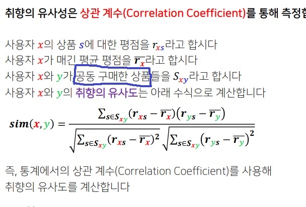 당연하지만 분자를 보면 같은 상품에 대해 둘 다 같은 방향으로 평점을 주면(둘 다 높은 점수를 주거나 둘 다 낮은 점수를 주거나) 상관계수 값이 커진다.