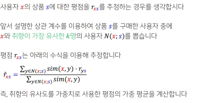 이 상관계수를 가중치로 이용한 k명의 상품 s에 대한 평점의 가중평균을 x의 추정된 평점으로 한다.