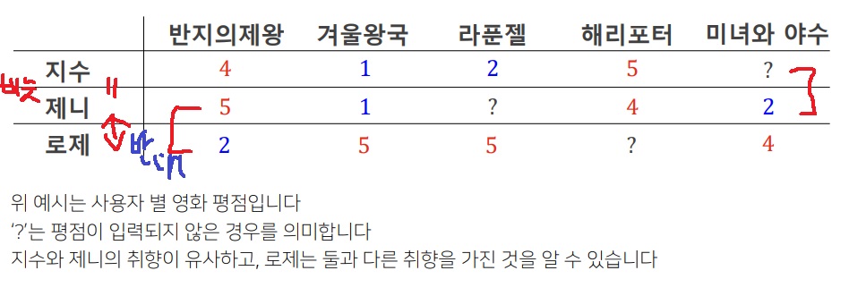 제니가 미녀와 야수를 좋아하지 않았기 때문에 취향이 비슷한 지수도 미녀와 야수를 좋아하지 않을 확률이 높아 지수의 "미녀와 야수"칸의 ?를 추측 가능하다