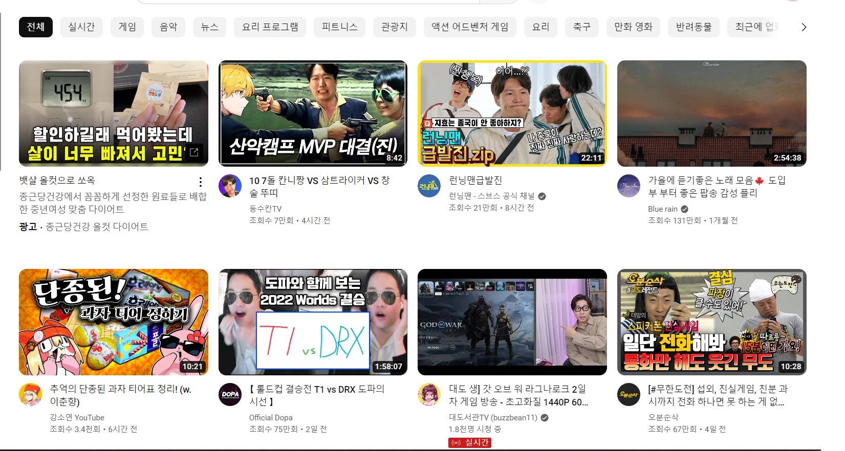 홈 화면도 추천이고 영상을 보고 나면 바로 밑에 나오는 관련 동영상도 모두 추천이죠.