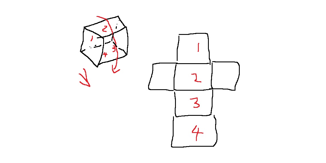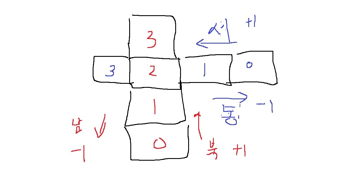 나머지 두면은 바뀌지 않지만, 굴릴때마다 윗면과 아랫면이 서로 똑같이 공유된다는 점을 고려해야한다