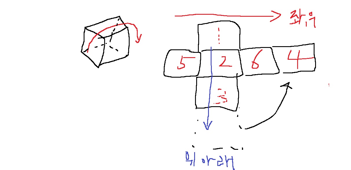 위 아래로 한번 굴리면, 양 옆을 관리하는 배열의 윗면과 아랫면도 동일하게 바뀐다는 점을 생각해야한다