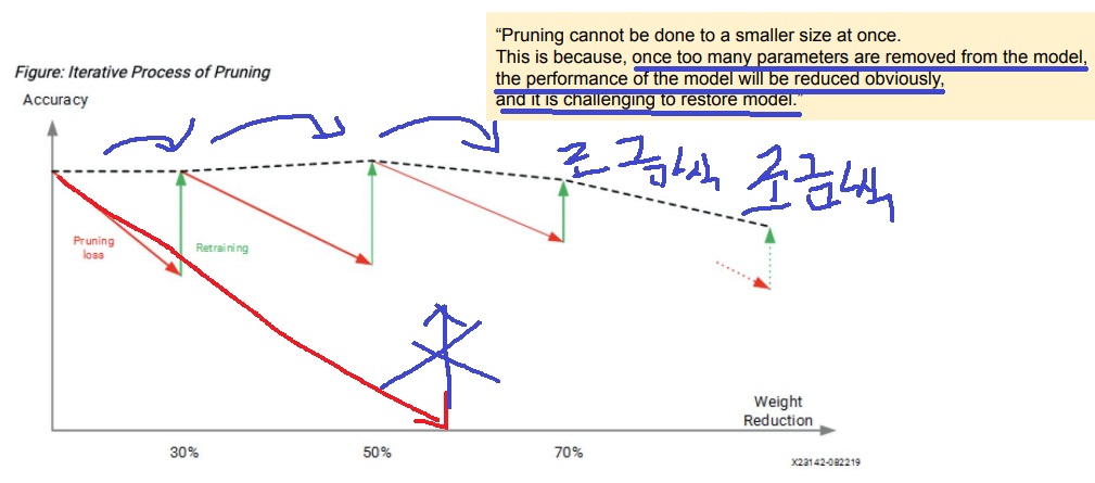 그래서 pruning을 조금씩 하고 retraining하고 다시 조금씩 하고 retraining하는 iterative pruning을 수행함